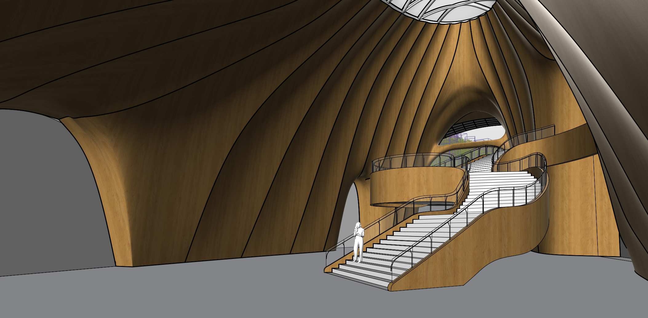 楼梯是建筑设计当中非常重要的构件,出现在建筑的室内室外。有的还作为建筑特色亮点。比如MAD亚布力企业家论坛中庭的大楼梯。这种曲线不规则复杂楼梯的建模可以使用RsTool来快速实现。