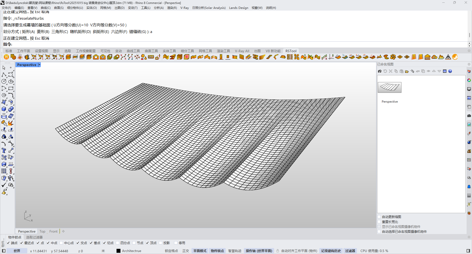 使用RsTool当中的rsTesselateNurbs命令对曲面进行细分,U输入10,V输入50