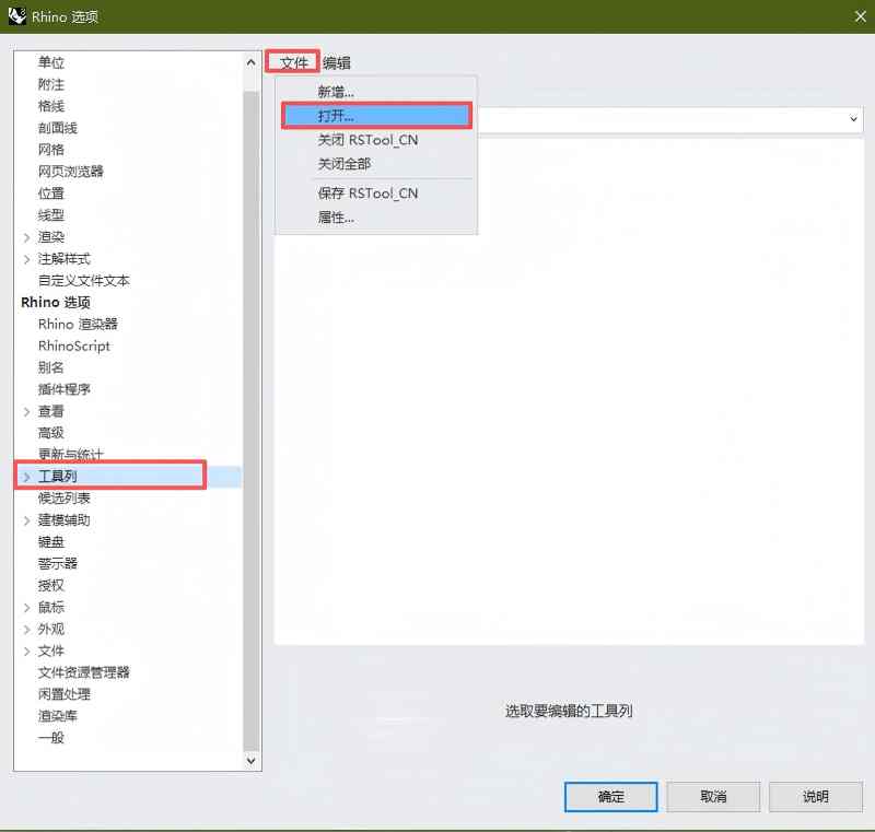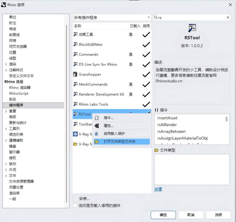 在犀牛选项工具列窗口打开RSTool_CN.rui