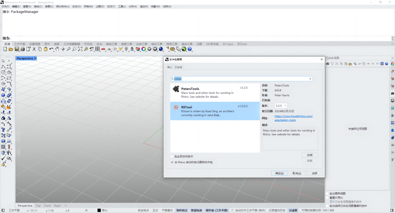 安装方法:rhino命令栏输入PackageManager,搜索rstool安装,安装完成后输入插件任一命令(如rswall)即可调出工具列。